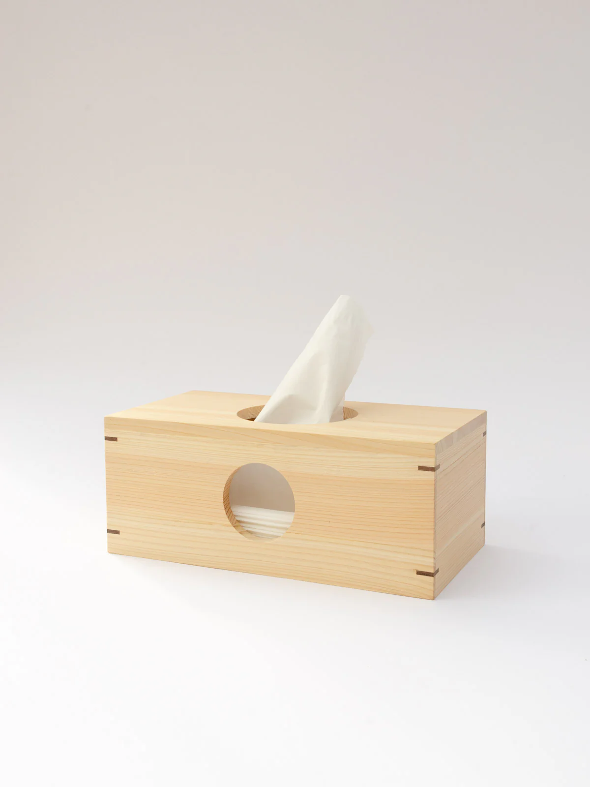 The perfect replacement for ugly disposable tissue boxes. Handcrafted from hinoki and traditional Japanese joinery, the bottom slides out to insert the tissues and the circle cutouts on the sides allow you to see how many you have left.